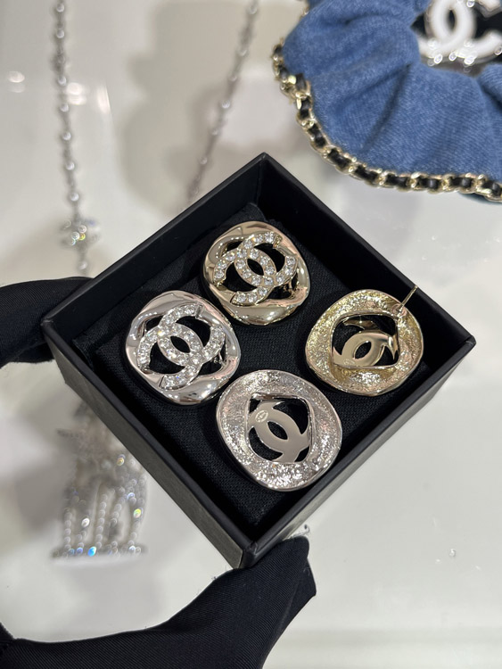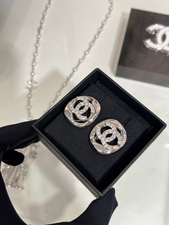 Celine silver full diamond double C hollow square earrings-3901